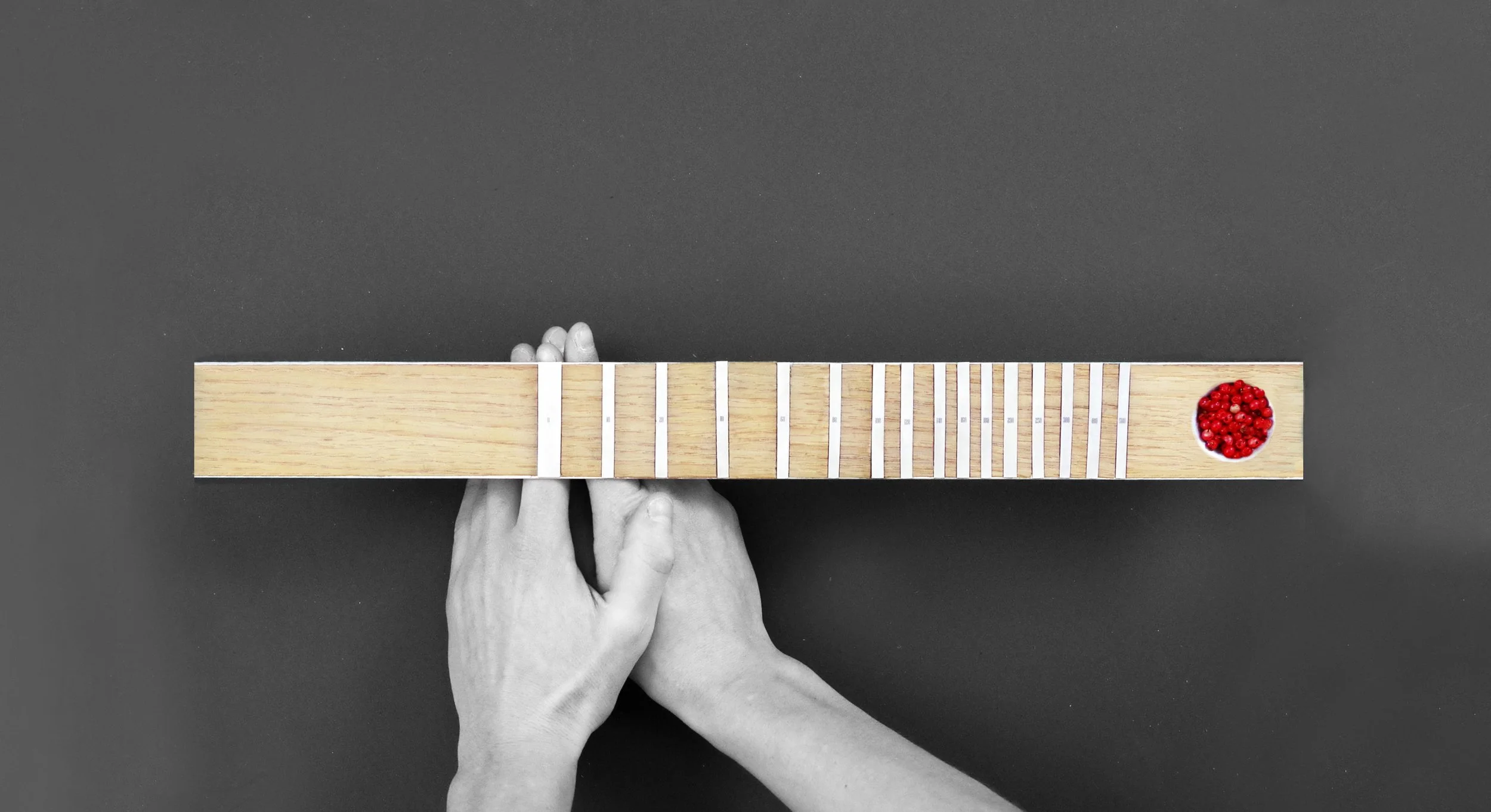 The smooth sliding of the index fingers towards each other maintains the mobile balance. By this double caress, the two fingers come together exactly at the center of gravity. This junction indicates the weight to be determined.