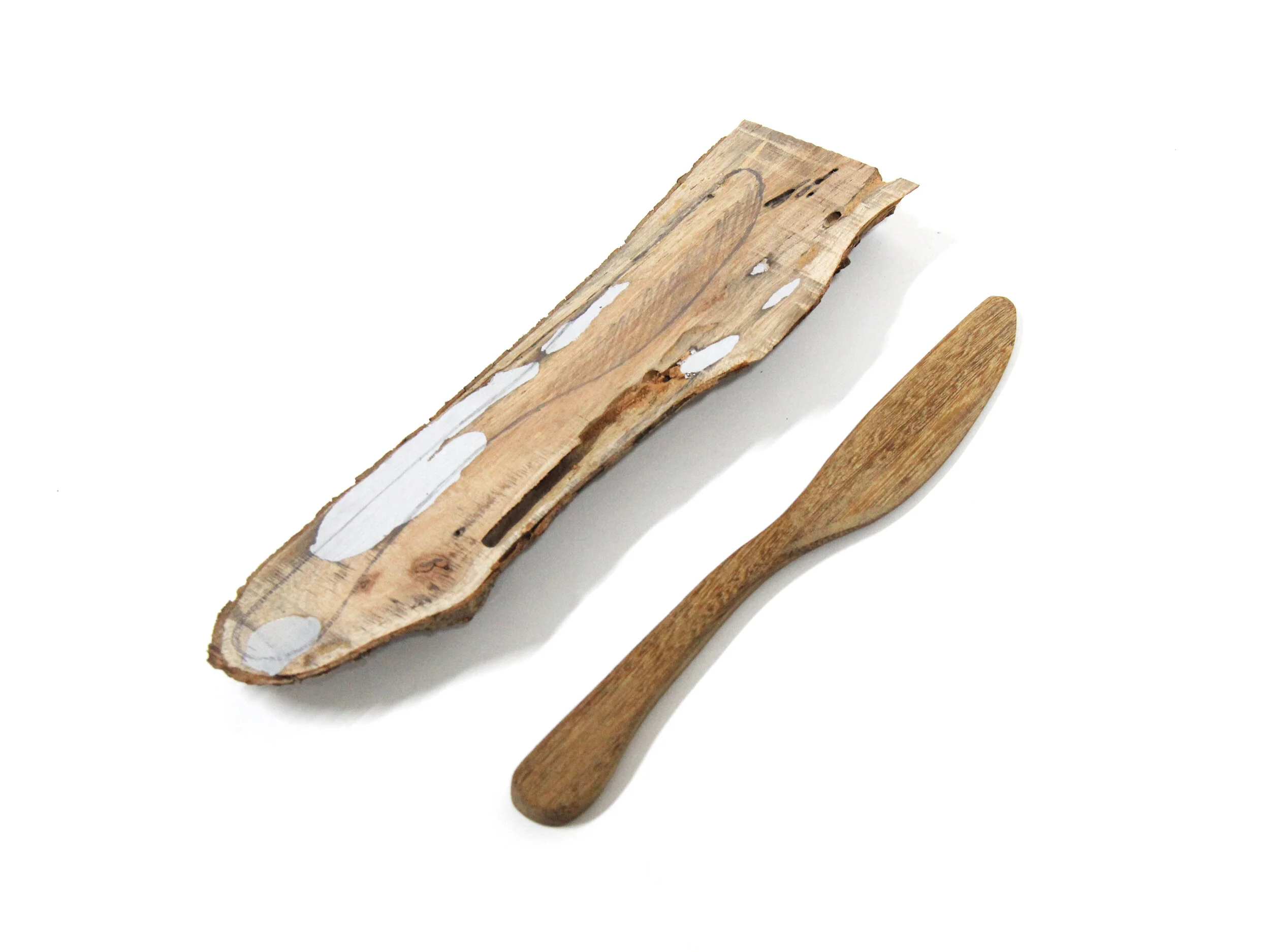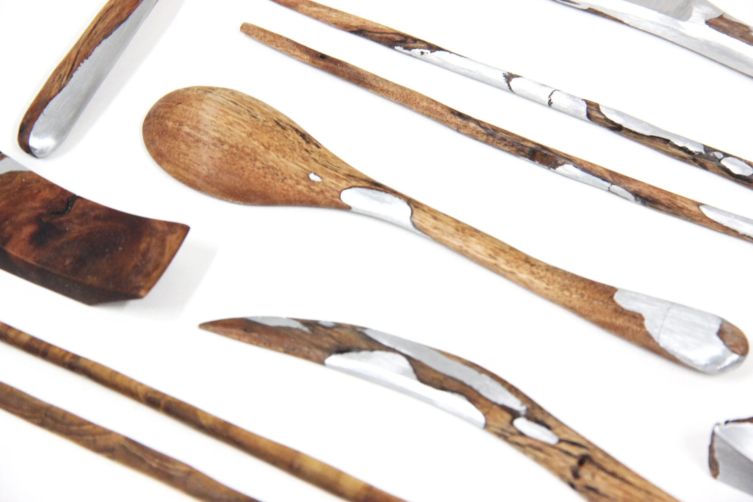 Coulé dans des bûches sculptées par les termites, l’étain blanc répare le bois en l’embellissant de motifs singuliers.