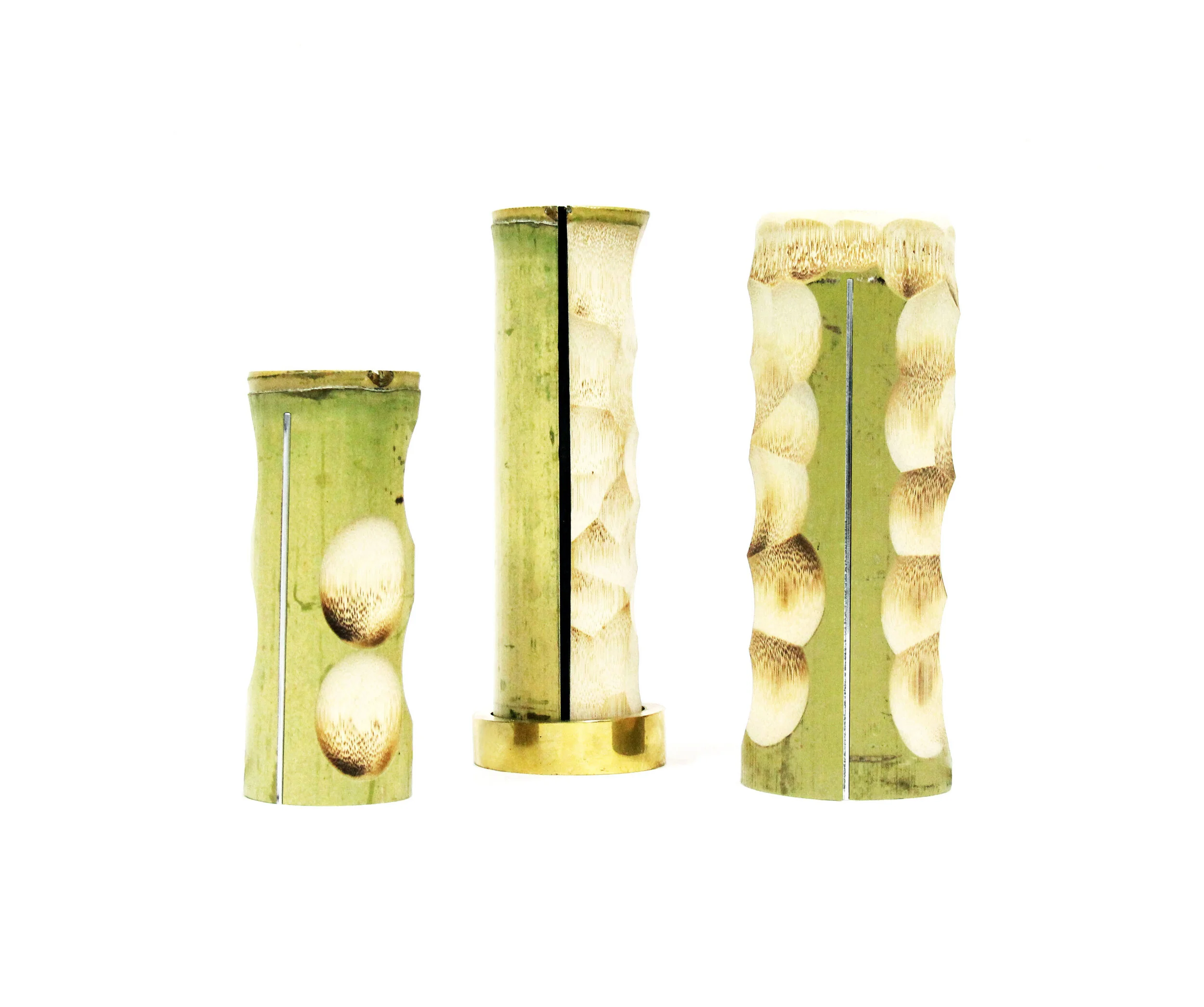 Découpe, ponçage et tournage amenuisent à loisir l’épaisseur du bambou, révélant ainsi un nuancier de translucidités.