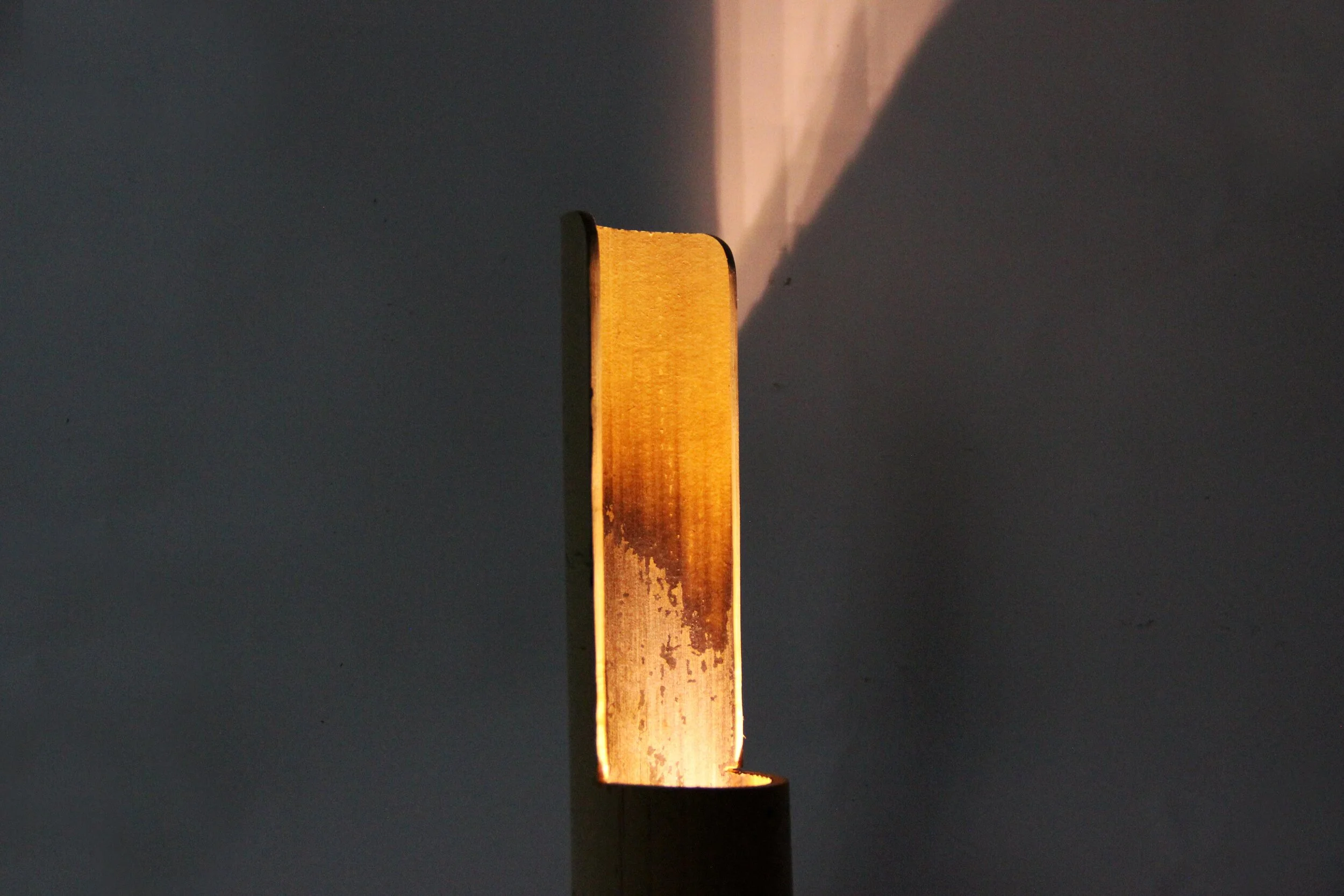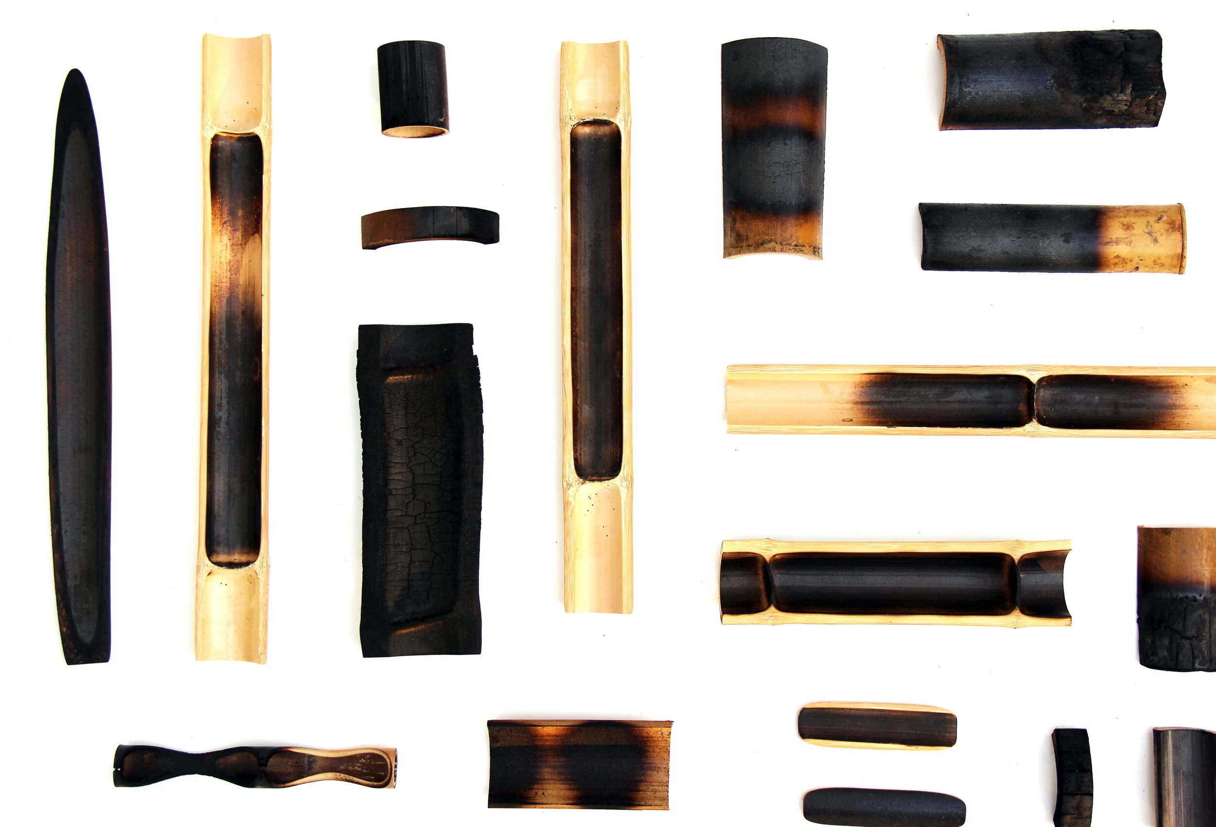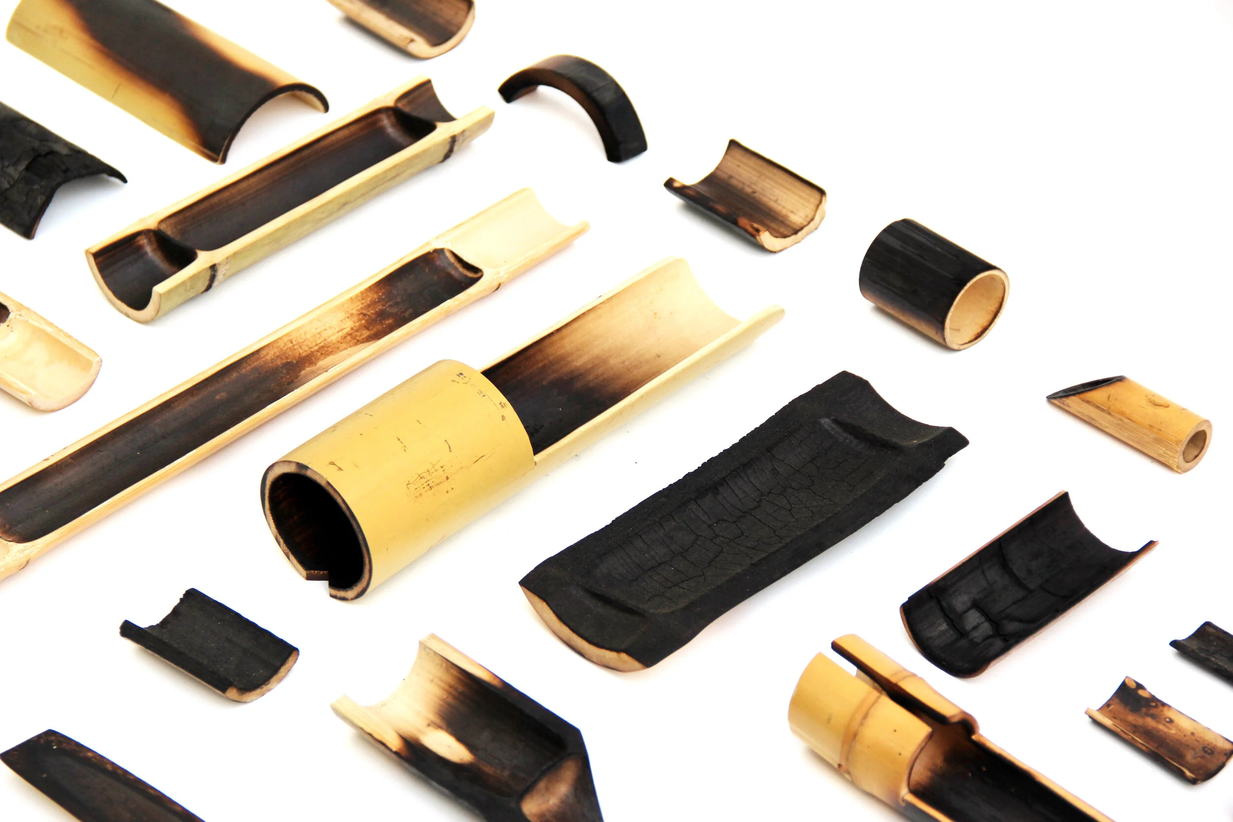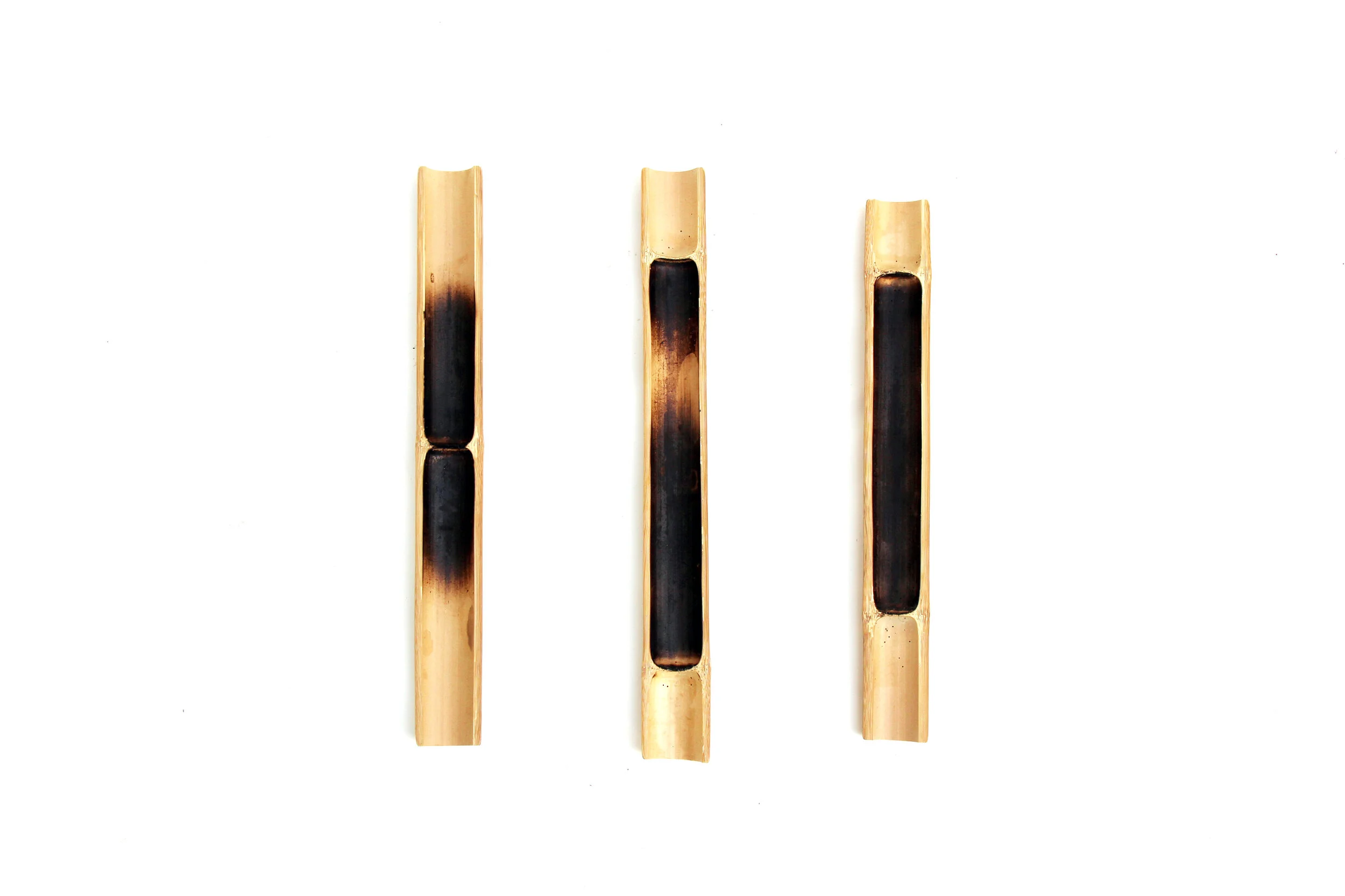 Lampes d’ambiance en bambou créées suivant la technique japonaise du shou sugi ban ou bois brûlé. Une riche palette de couleurs et de contrastes se dessinent au fil de la flamme.