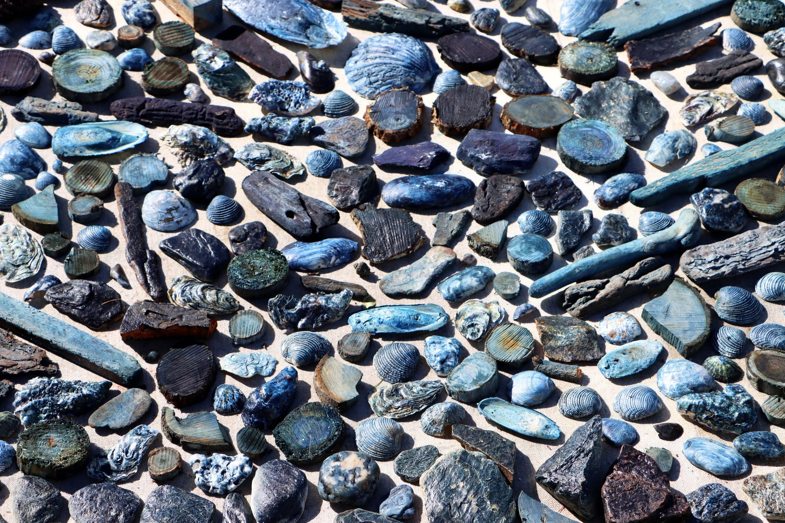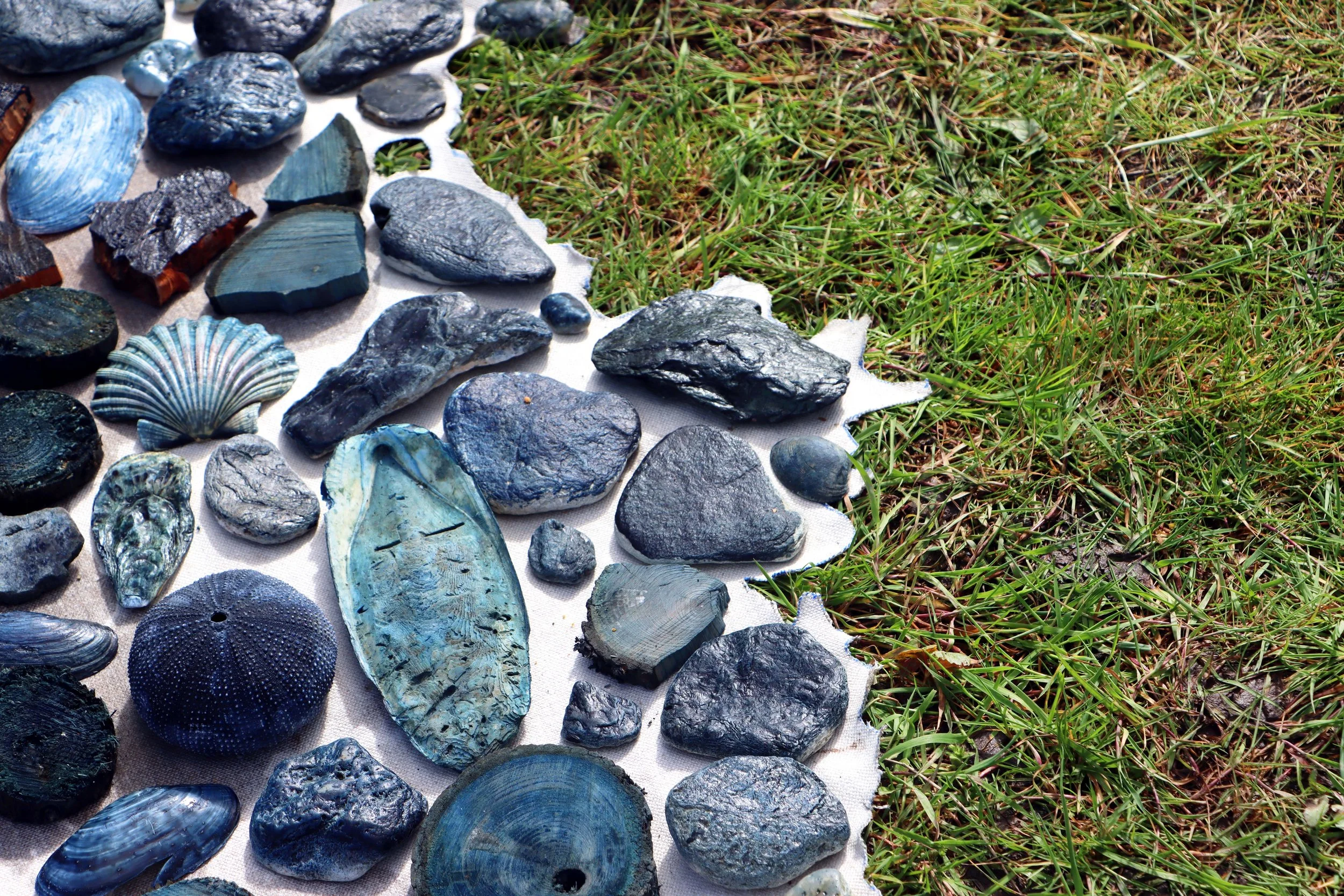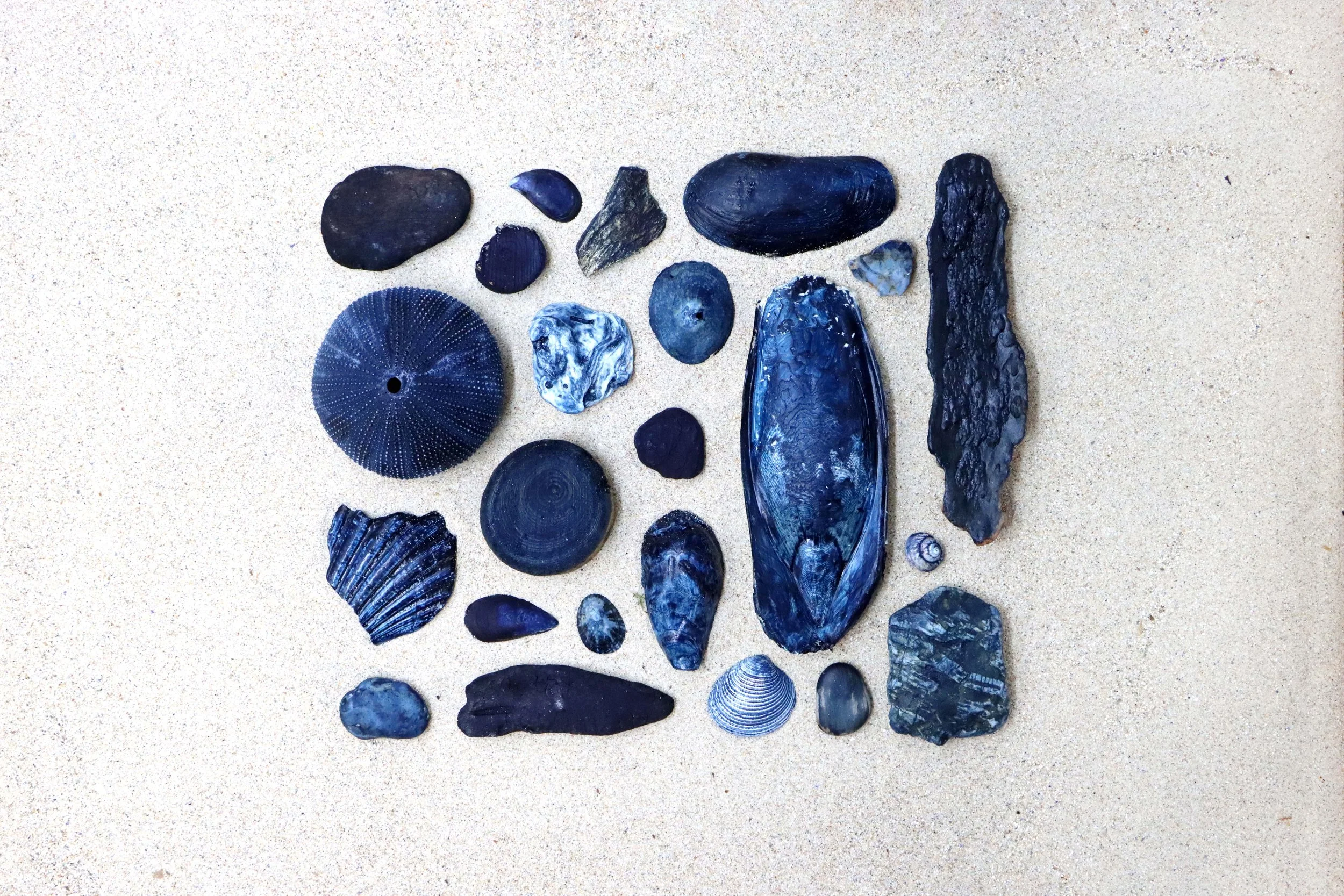 🌱 Pierre, écorce, bois, pomme de pin, coquillage, os de seiche, toile de lin local, pigment de persicaire à indigo bretonne