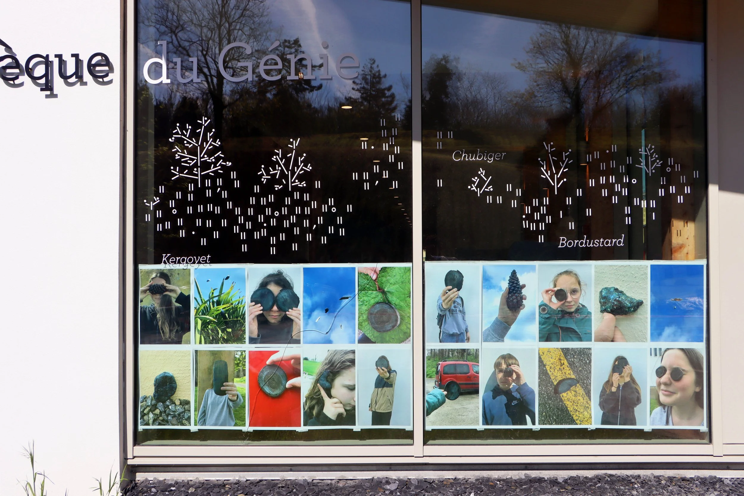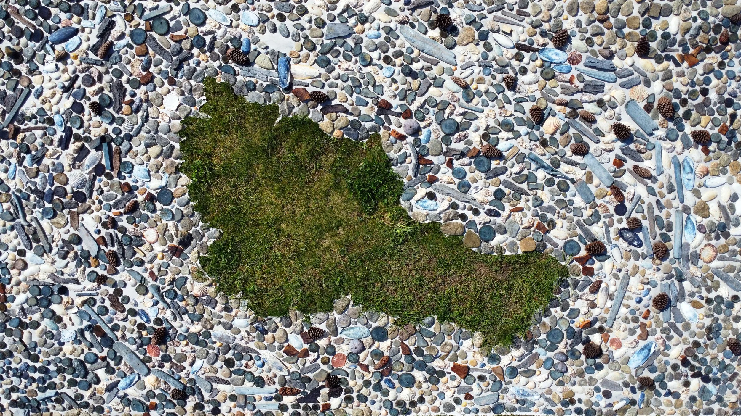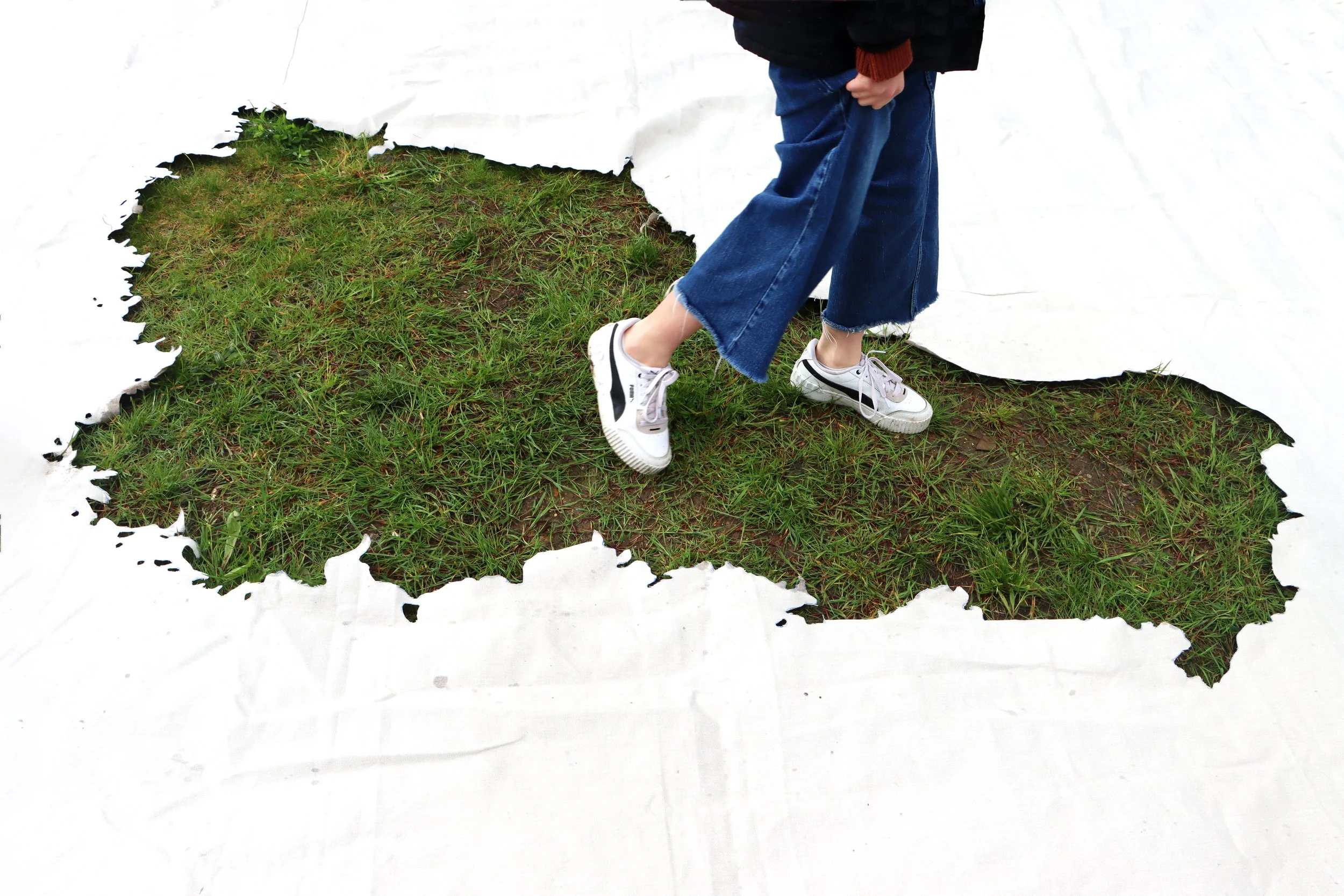 Fragments de Belle-Île-en-Mer est installé aux portes du Bois du Génie, devant la bibliothèque municipale, où sont aussi exposées les recherches préliminaires au projet. Révélée pour l’été 2024, cette cartographie géante et naturelle évolue, se ternit et se désagrège progressivement sous l’action des éléments naturels : pluie, vent, soleil, …