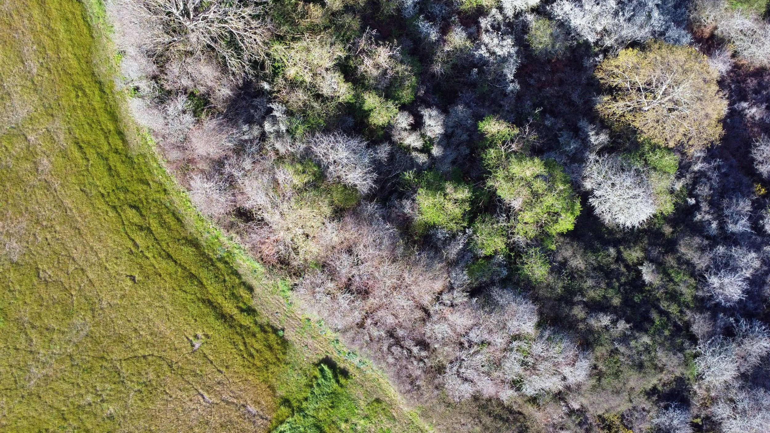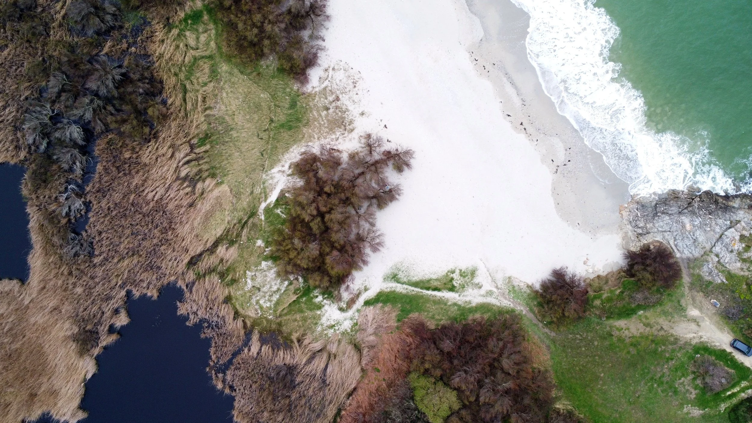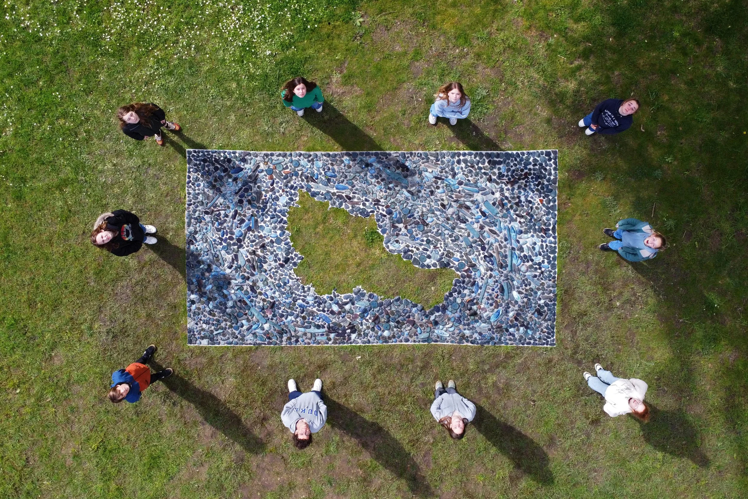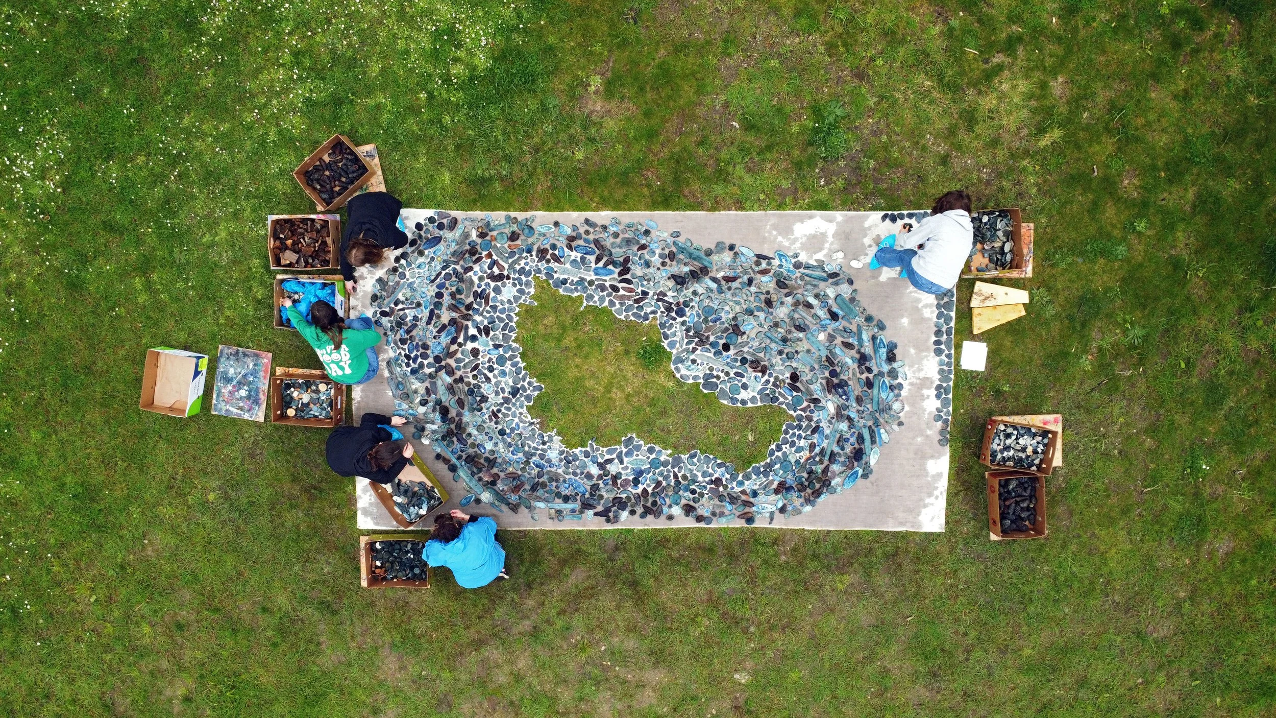 Créée comme un puzzle-témoignage, Fragments de Belle-Île-en-Mer est une œuvre monumentale, collective et éphémère qui dessine l’île vue du ciel. Elle se compose d’éléments naturels bruts, glanés sur site par l’artiste et les élèves de 4ème du collège Michel Lotte, lors d’une résidence d’un mois en milieu scolaire. Après une phase de recherche tinctoriale avec les collégiens sur ces matériaux inhabituels, les éléments ont été colorés avec de la persicaire à indigo bretonne. Ainsi, les matériaux mêmes du land-art représentent le territoire insulaire. L’empreinte océanique, vide en son centre, se laisse alors coloniser par l’herbe, faisant ressortir l’île petit à petit.