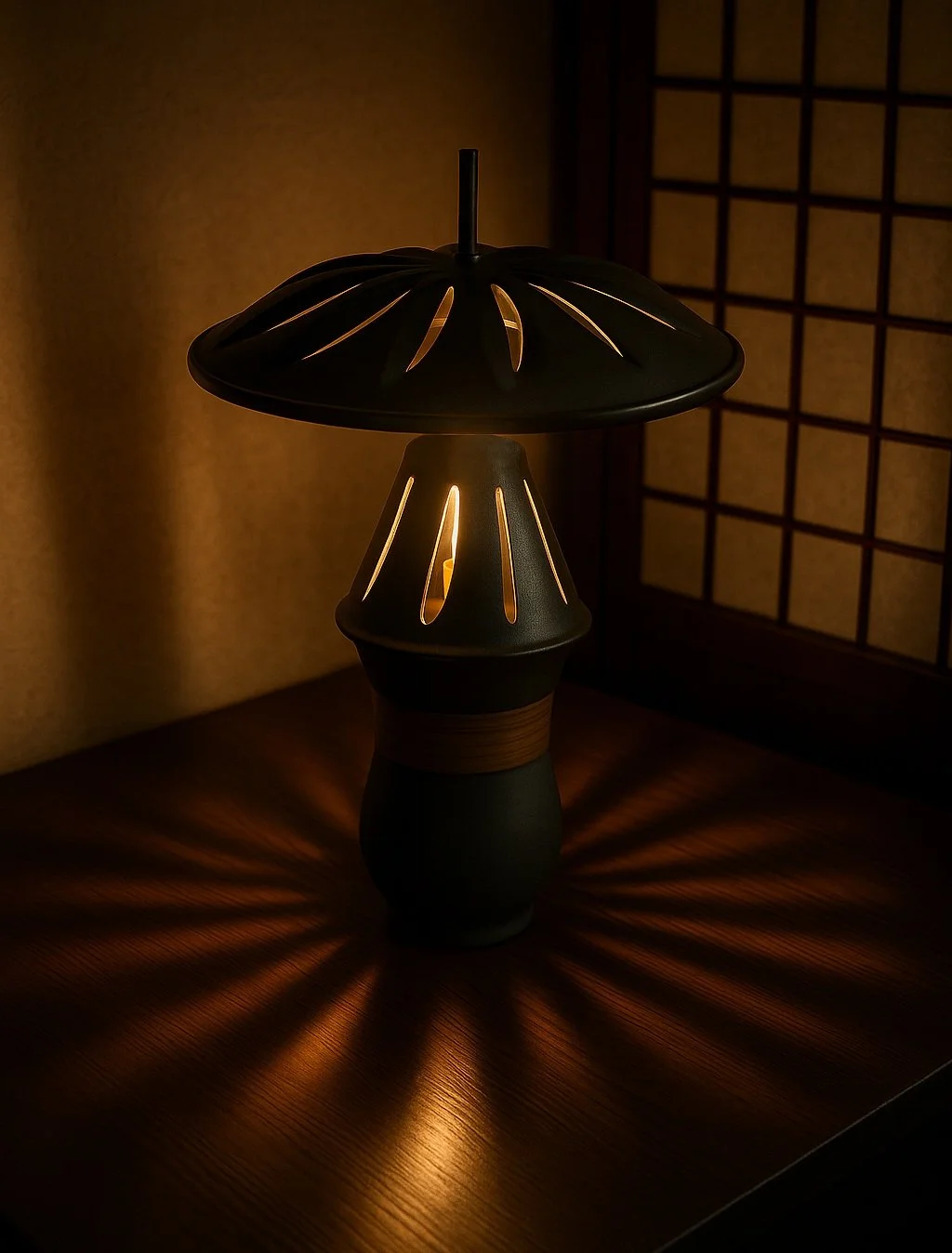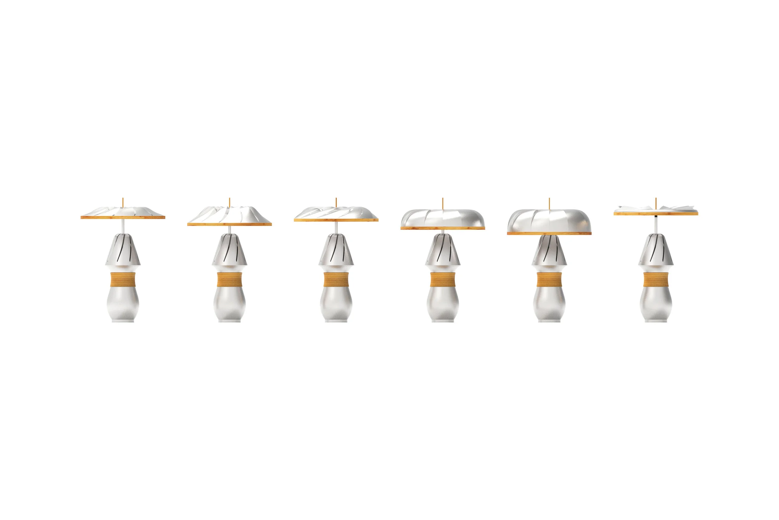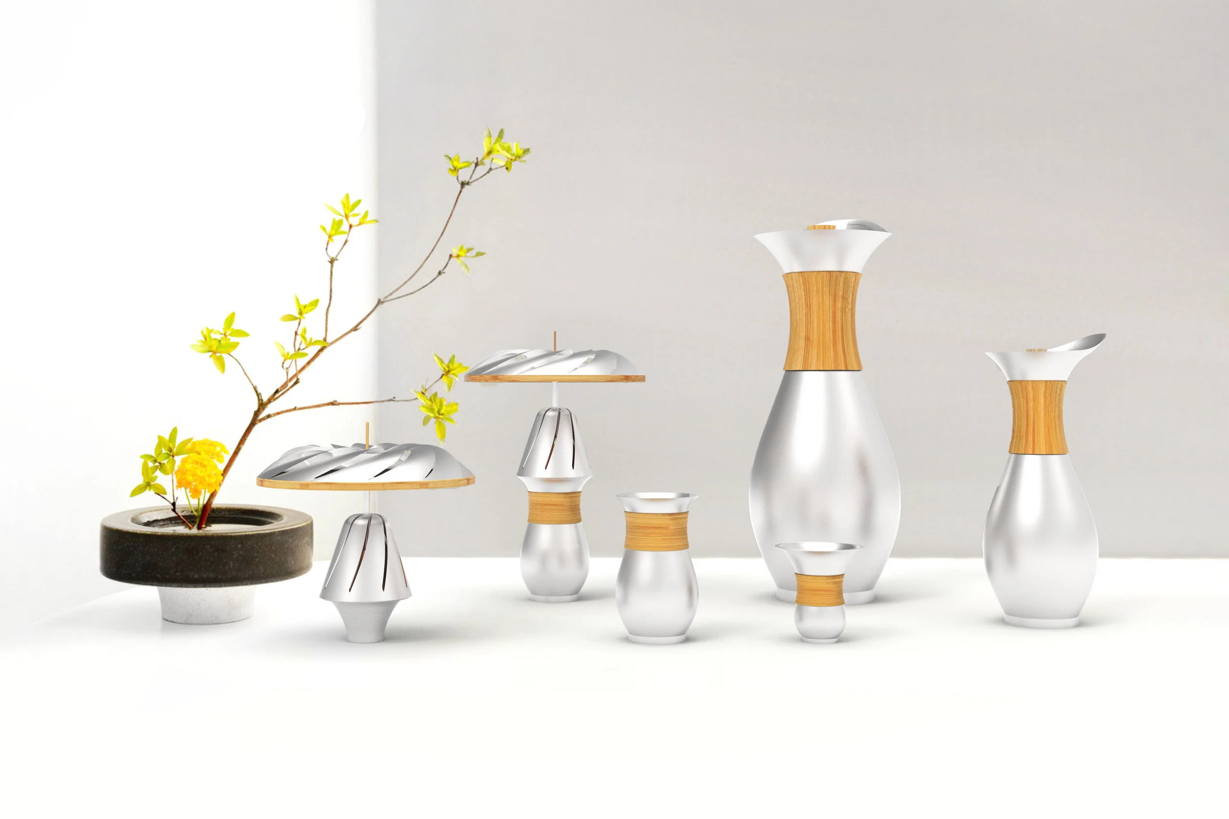 Cet ensemble de sept pièces s’inspire de la lanterne magique taïwanaise, objet traditionnel très ancré dans le territoire. Il utilise la chaleur d’une bougie pour faire tourner un disque métallique ajouré, empli de vin de thé, sur une tige de bambou. Ce mouvement lent développe alors parfums et arômes avant la dégustation.